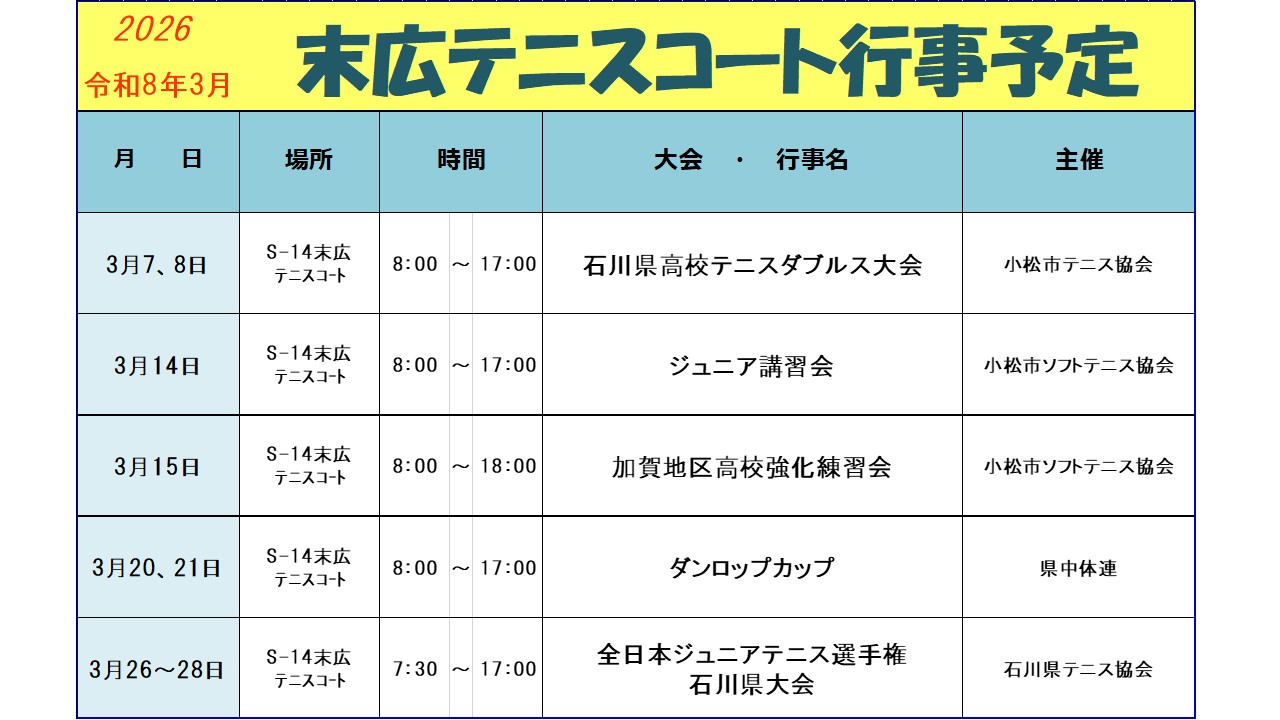 末広テニスコート3月行事予定です。