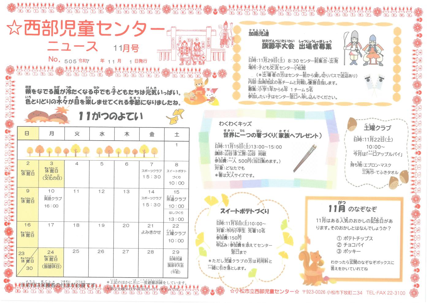 お知らせ HOMEお知らせ一覧センターニュース11月号できました 2025.10.31福祉・学童new【西部児童センター】センターニュース11月号できました センターニュース11月号できました。 木々の葉が赤や黄色などいろとりどりに色づいてきました。 朝は肌寒く日中はあたたかく着るものに困ってしまいますね。 11月も食欲の秋・芸術の秋というようにセンターでもこの時期ならではの行事を色々企画しています。 添付ファイル 前へ 一覧 次へ