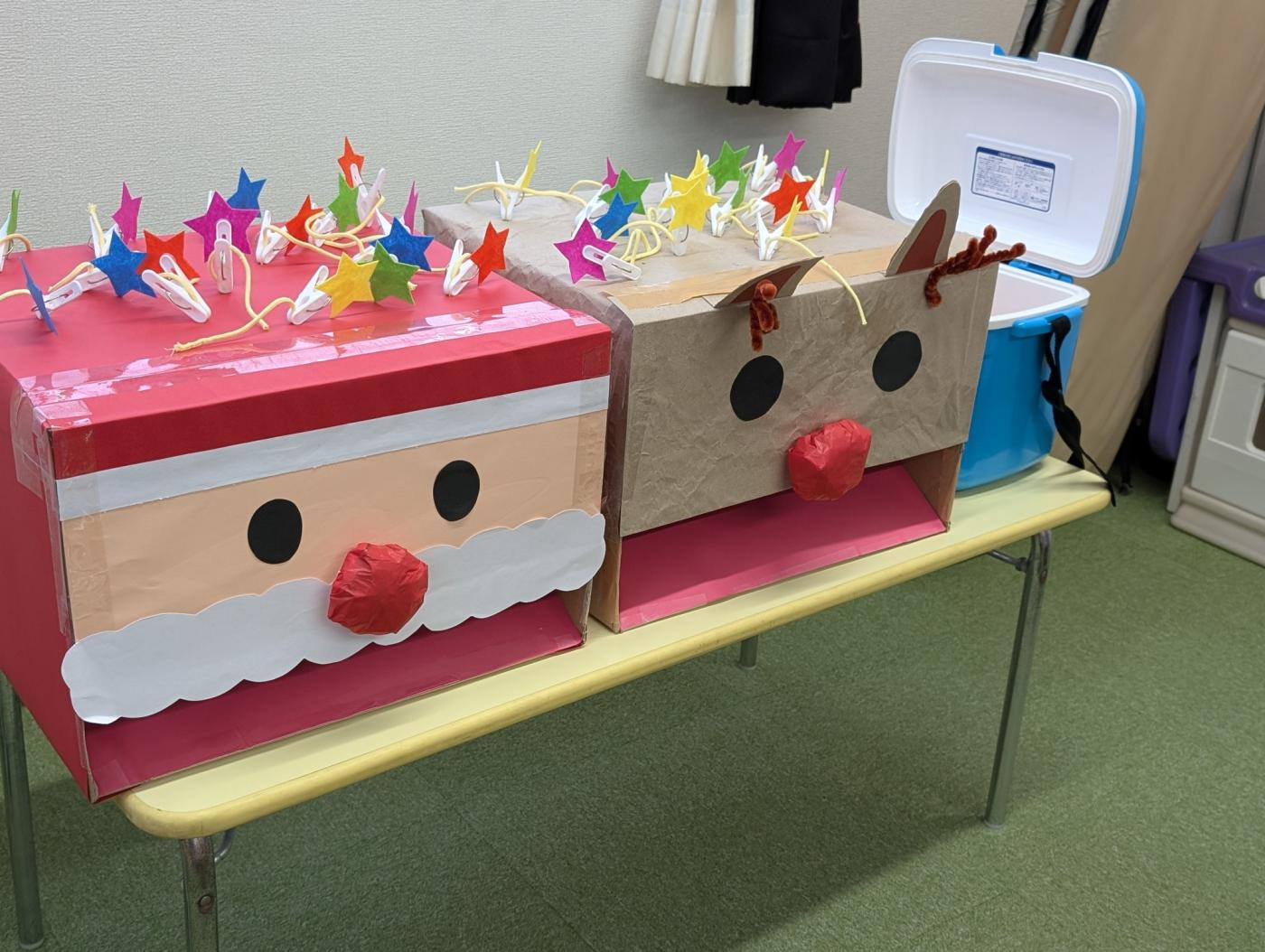 せっかくなのでおやつもクリスマスモードで楽しもう!!ということで、サンタとトナカイの箱にバラバラのおやつをセット。
