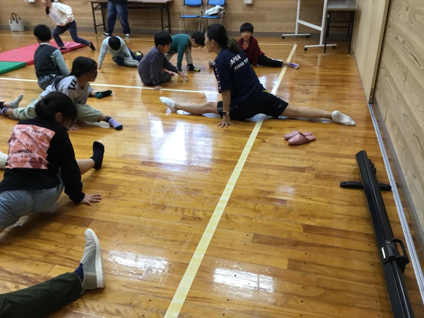 児童と一緒にストレッチをしたり(当然ですが、中川真依さんの身体の柔らかさには児童も職員もまたまたびっくり!)、