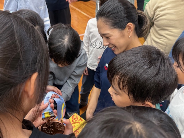 貴重なメダルを見せていただき、握手もしていただき、児童もとっても喜んでいました