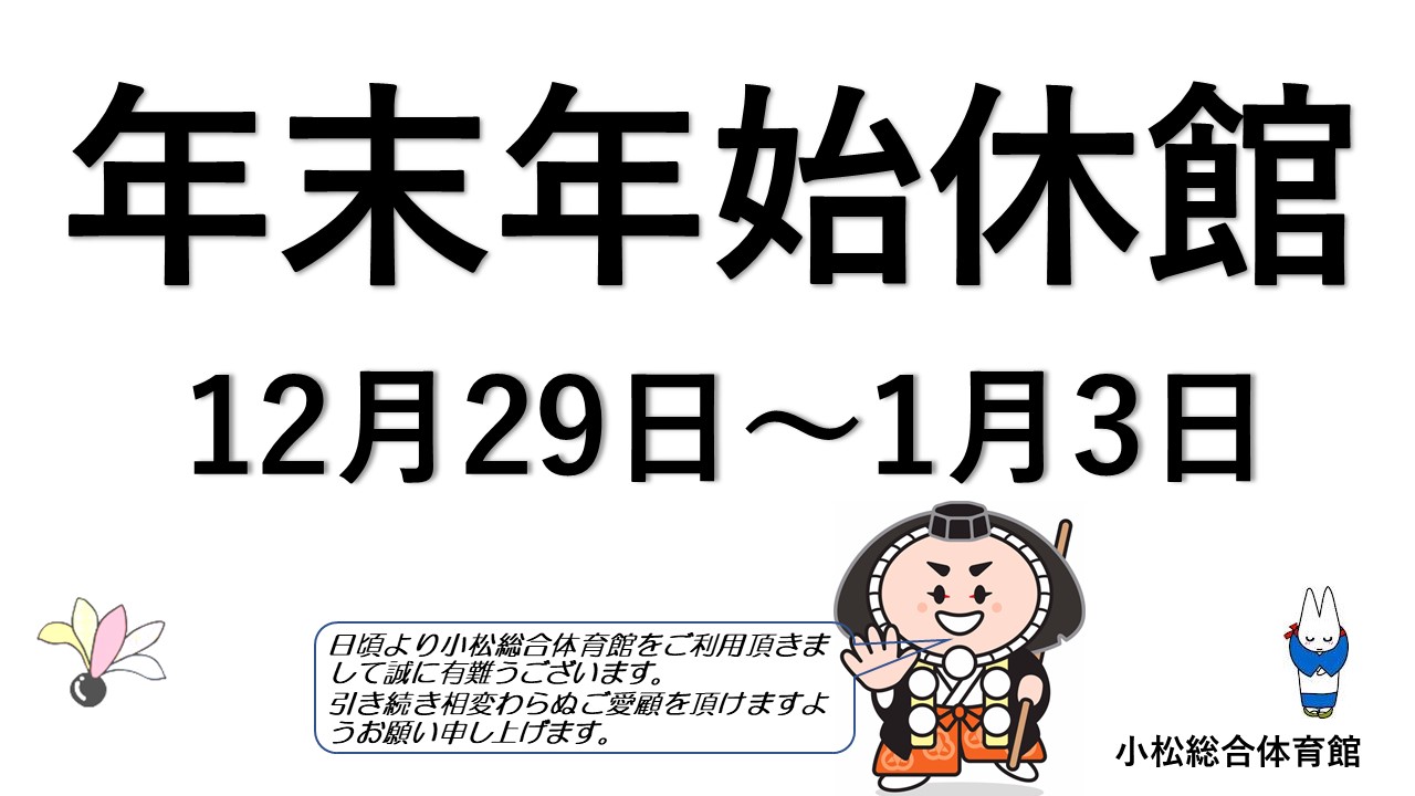 お知らせ HOMEお知らせ一覧 年末年始休館のお知らせ 2025.12.03スポーツnew【小松総合体育館】 年末年始休館のお知らせ 日頃より、ご利用いただきましてありがとうございます。 来年もよろしくお願いいたします。 一覧 次へ