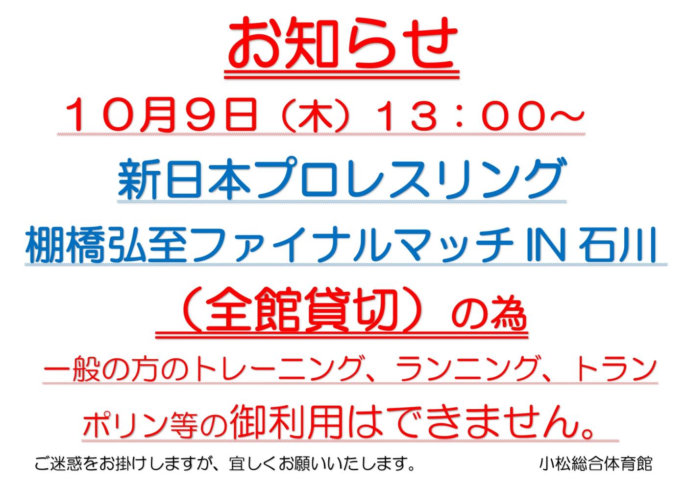 小松総合体育館 施設TOP お知らせ 施設について ご利用案内 申請・料金表等 交通アクセス 目的別施設一覧 施設予約 HOMEスポーツ施設小松総合体育館お知らせ【お知らせ】10月9日 体育館の施設利用について 小松総合体育館からのお知らせ 2025.10.09スポーツnew【お知らせ】10月9日 体育館の施設利用について ■10月9日、新日本プロレスリング開催につき本日、午後13:00から全館貸し切りのため 一般の方のトレーニング、ランニングコース、トランポリン等はご利用出来ません。 観覧席での見学も出来ません。 ご不便をお掛け致しますが、ご理解の程よろしくお願いします。 一覧 次へ